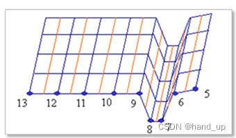 4.Grouser mesh格栅网: 当车辆在软土上运行时,用点来定义接触是不够的。因此,必须提供更多的点,以在格栅的表面形成斑块。为了实现这一目标,可以将格栅的长度和深度划分为若干段。例如,当起点节点数为5,终点节点数为13,长度段为2,深度段为4时,轨道链接光栅的网格划分如下。