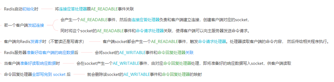 当被监听的socket准备好执行accept、read、write、close等操作时,操作对应的文件事件就会产生,这时FEH就会调用socket之前关联好的事件处理器来处理对应事件。