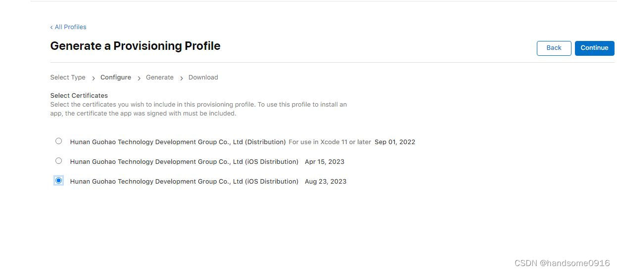 三、过程中还要我们选择证书,假如我们刚才的步骤中,创建过两个cer证书,则下图这里的过程会显示有两个cer证书可以选择,假如你有多个证书,这里可别选错的,选错了的话生成的profile文件就会跟我们导出p12文件的cer证书不匹配了。: