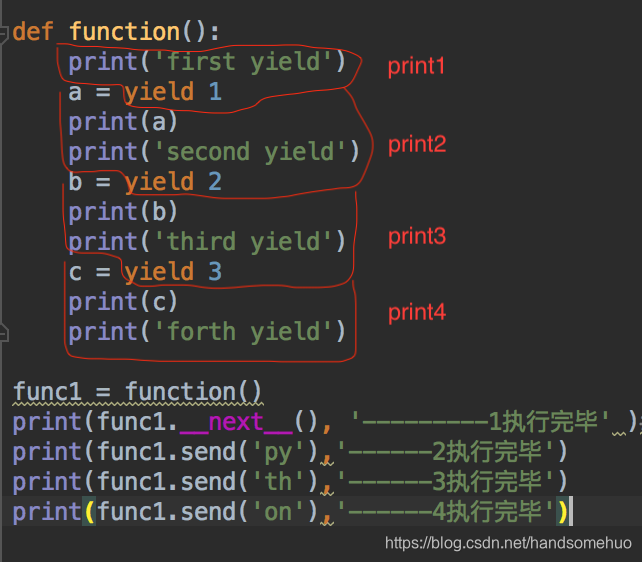 print('生成器到第三个yield停止', func1.__next__(),'\n---------4执行完毕')