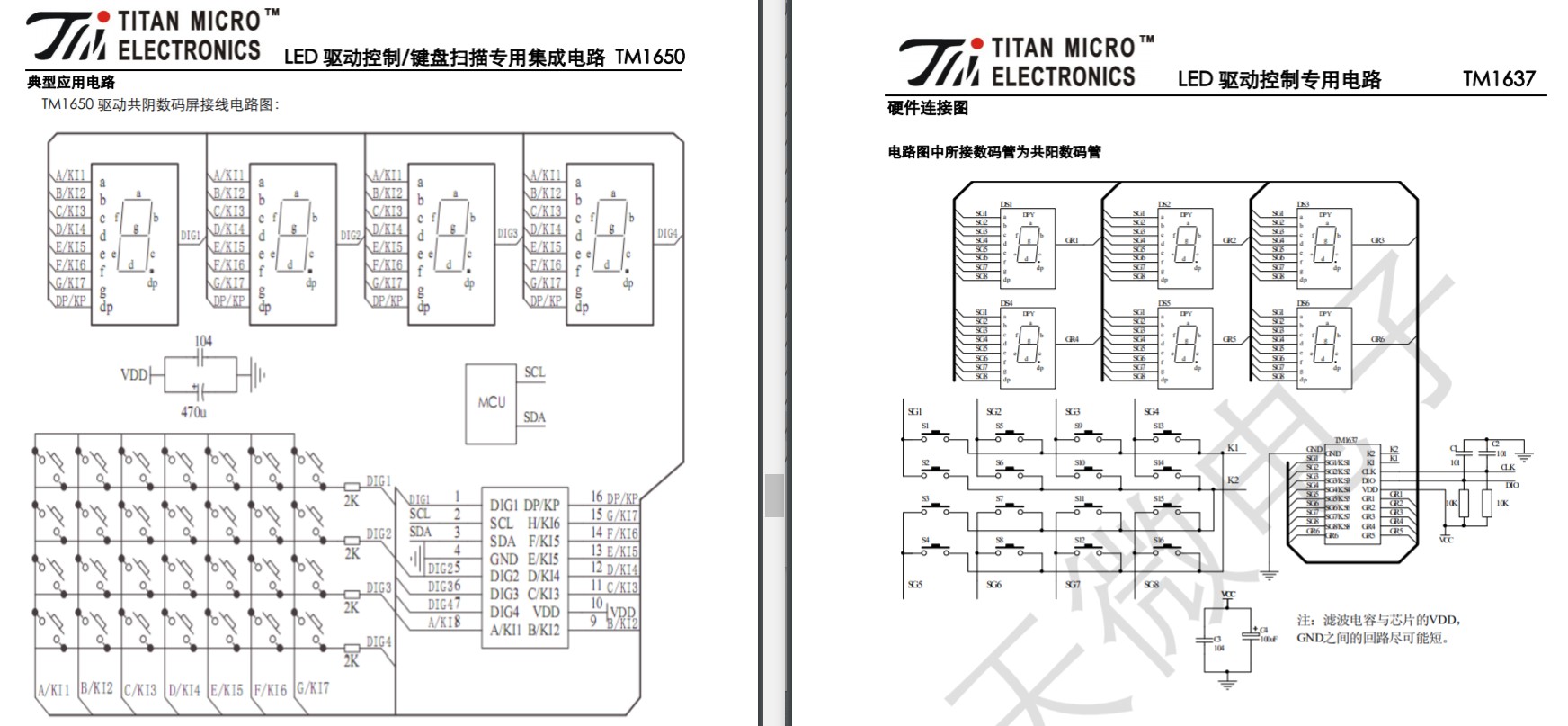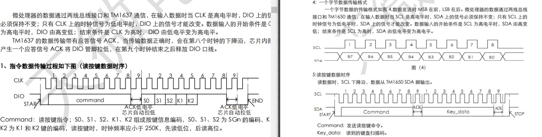 TM1637 与 TM1650 是同一厂家生产的同类芯片,主要用于驱动 8 段数码管和扫描矩阵键盘(请看 Sugar 写的《看 Sugar 讲矩阵键盘的使用》)。