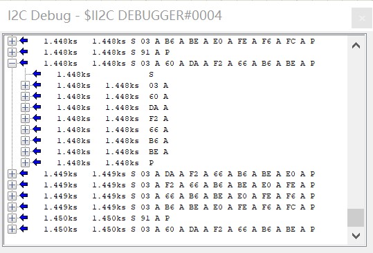 展开一组数据,可以发现 TM16xx 驱动 8 段数码管时发送的数据是:“命令” + “数据”的形式,与 datasheet 所述一致。这就表示 TM16xx 不是 I2C 从设备,没有常规的“I2C 从设备地址”。