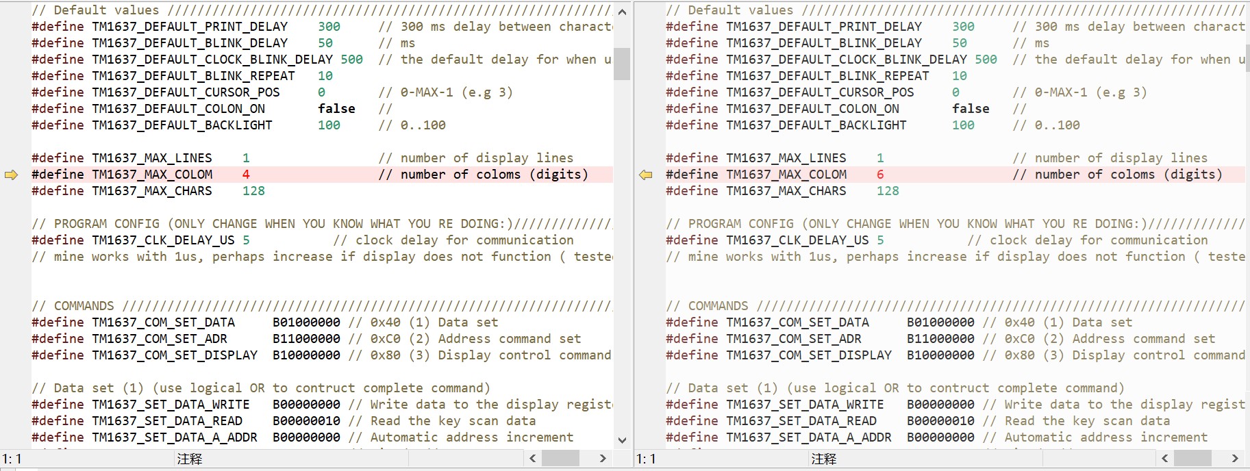 Sugar 用了 6 位 8 段数码管显示“1234567890”,这个库原生支持 4 位 8 段数码管,变成 6 位并且不丢显示内容的话需要做 2 处修改。Sugar 给出其中一处的提示,读者可以尝试通过架构调试锁定另一处的位置,并改之。第一处的提示如下:
