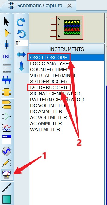 在 Proteus 中芯片直接搜型号就能找到,本次用到的虚拟仪器有“ I2C 总线监视器”和“示波器”,到下图所示的地方找: