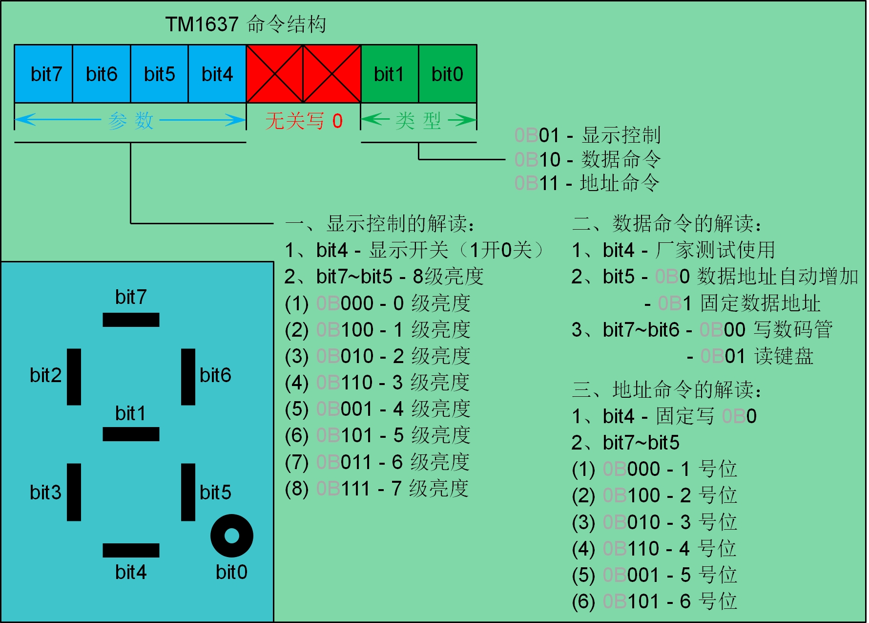 搞清楚以上两点,就已经会用 TM16xx 芯片了。搞清楚之后,因为不按常规出牌的 datasheet 给数据分析带来麻烦,所以 Sugar 从常规角度按 datasheet 做了个总结,看下面这个图来做数据分析就舒服多了: