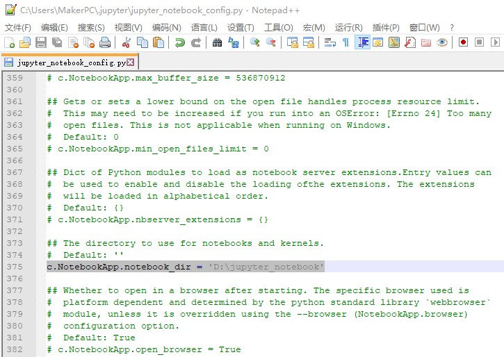 (3) 修改配置文件(搜索关键词 c.NotebookApp.notebook_dir),如下图: