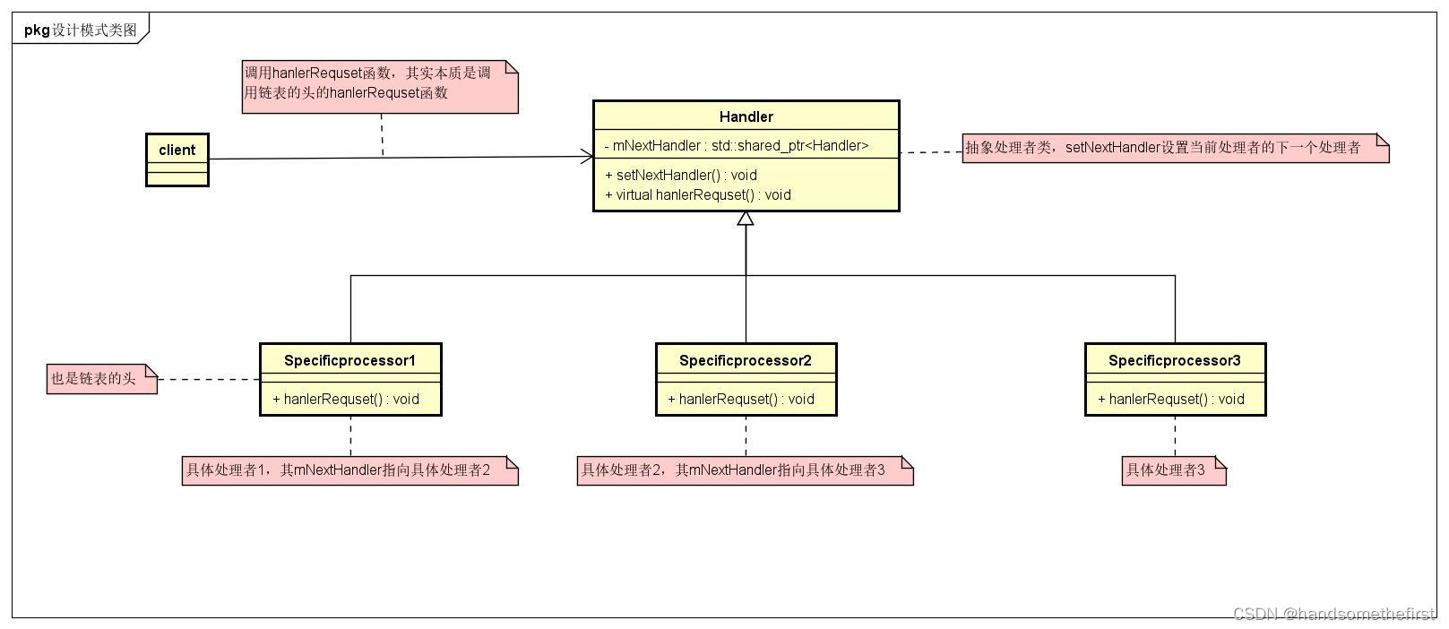 1.客户端类:首先其需要创建并组装处理者对象链,即客户端需要通过SetNextHandler函数,将其mNext指向下一个处理者,然后形成一个链表,当客户端发送请求的时候,只需要调用第一个处理者的处理函数即可。