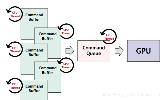 Vulkan的命令缓冲都是独立的互不干扰的单元。支持在多个线程中创建。这样就能够由多个线程创建不同的绘制命令。由单独的线程管理渲染命令队列,统一提交给GPU绘制,例如以下图所看到的: