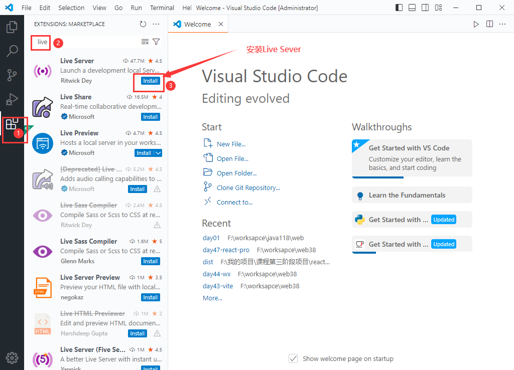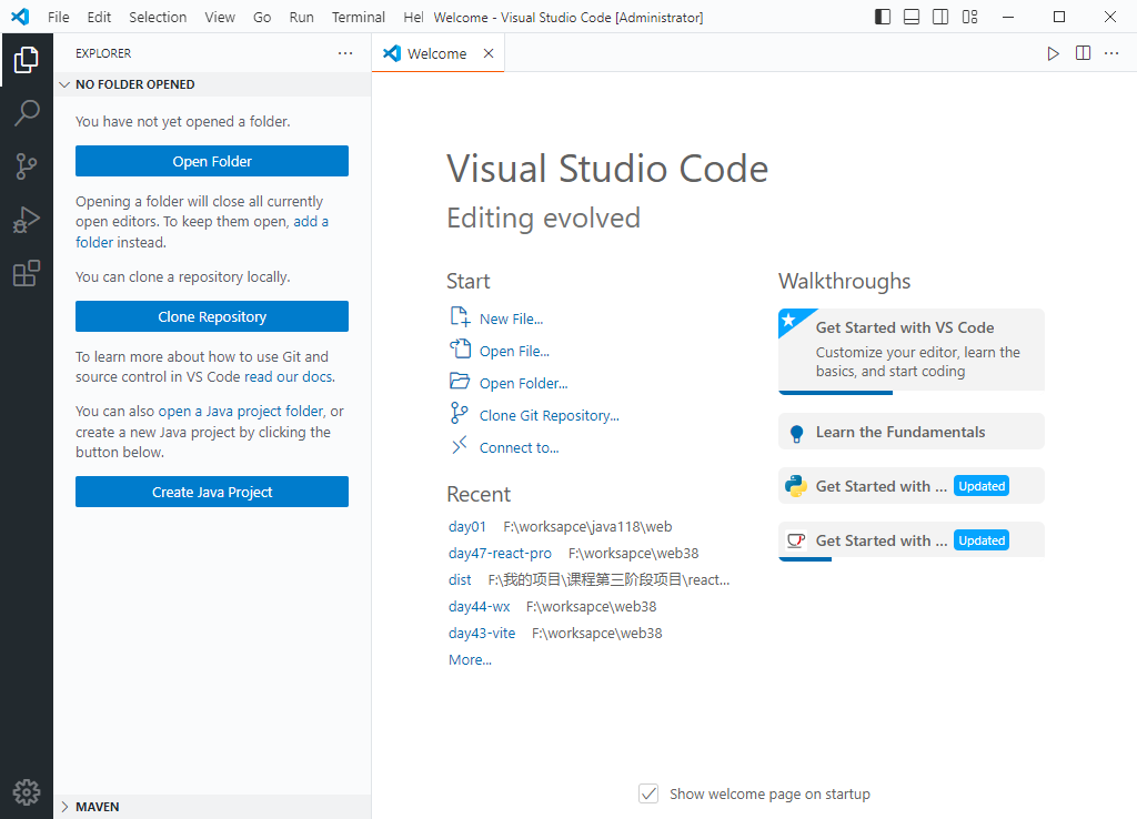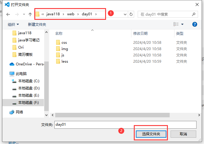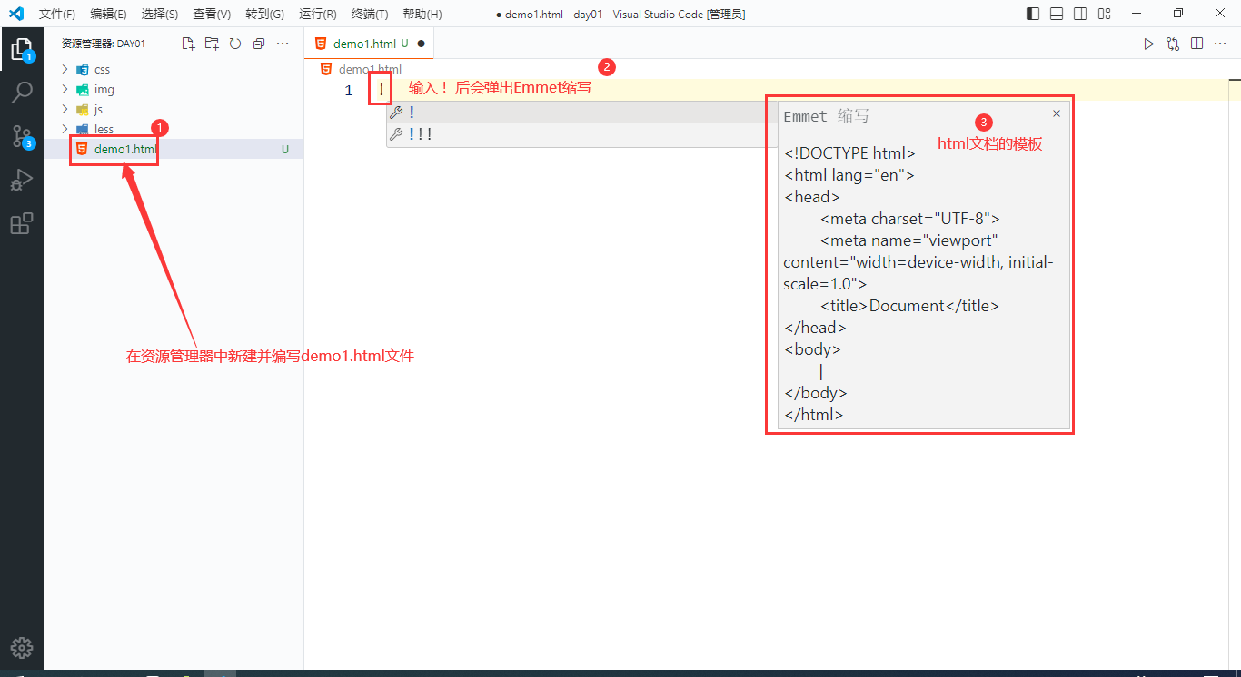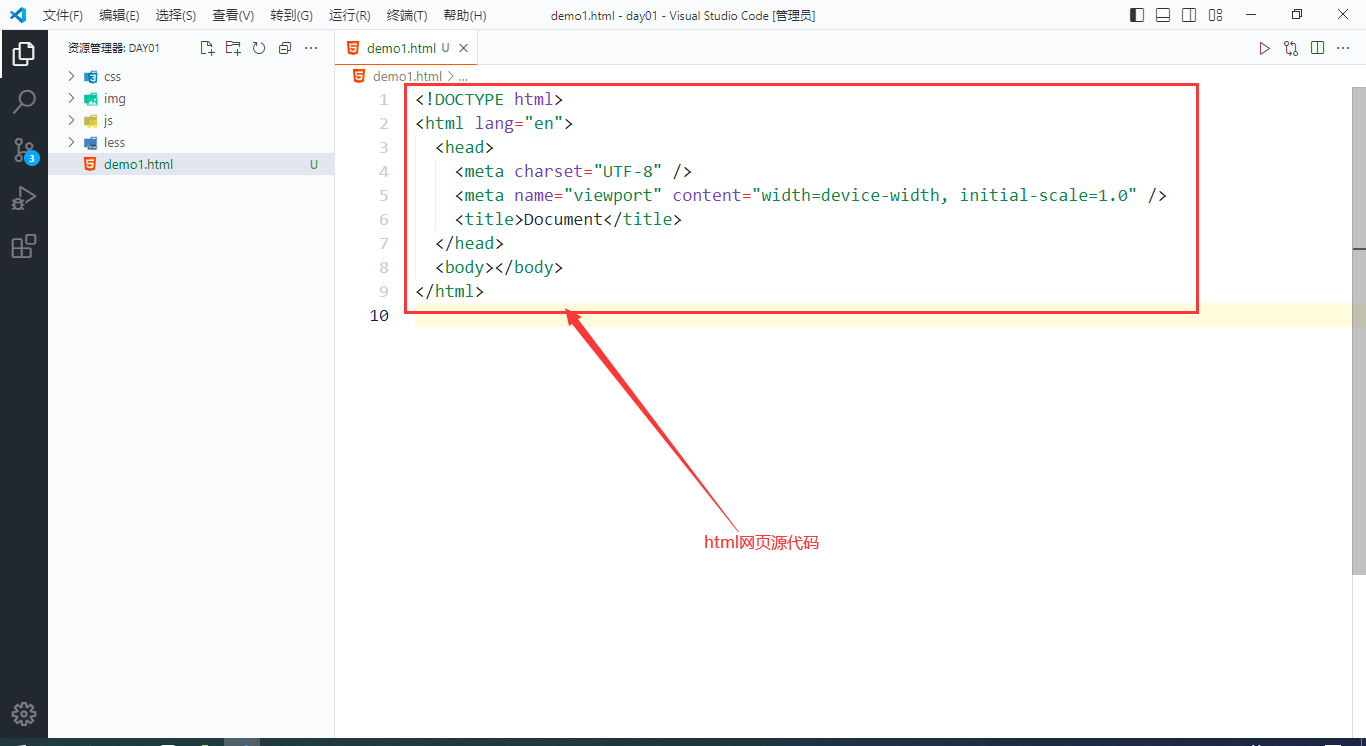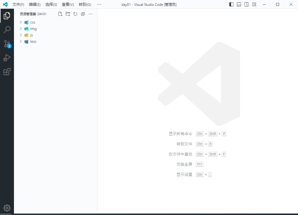 - 新建工作目录:web/day01, 在day01中添加三个文件夹css、img、 js, 使用vscode打开day01目录