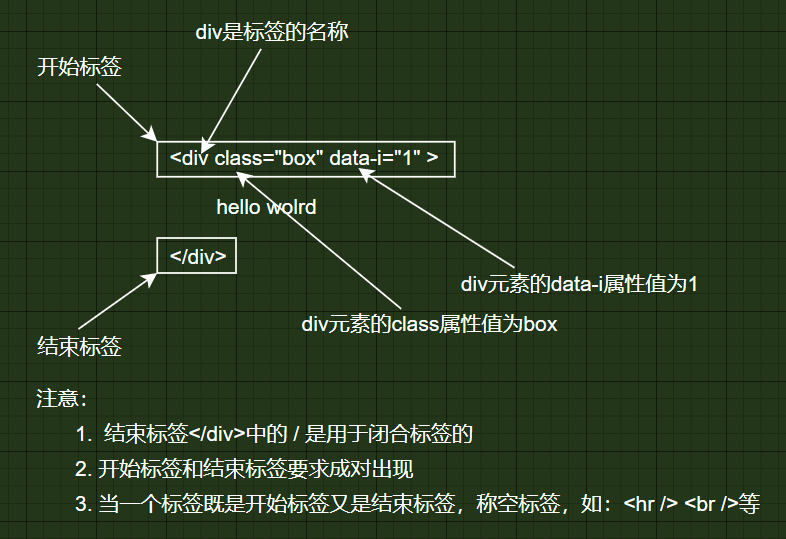 - 标签又分为开始标签和结束标签,标签有标签名称,属性列表等组成。