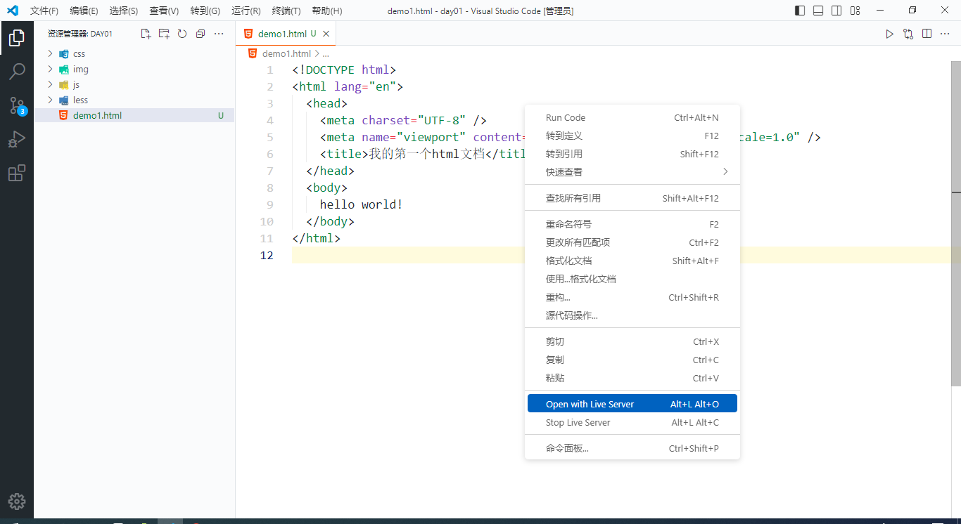 - 启动网页:在demo1.html文档中,点击右键选择: Open with Live Server