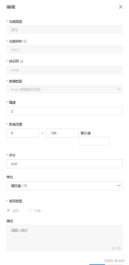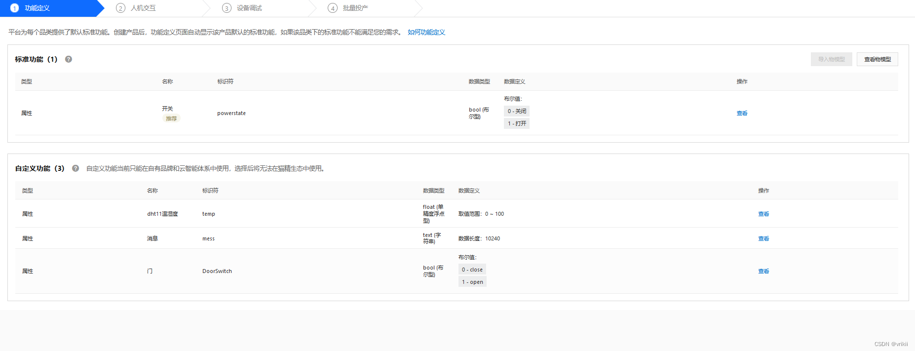 创建新产品后,进行功能定义,已经默认有一个标准功能,还可以根据自己的需求添加自定义功能。例如温湿度等等...