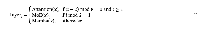 受 Jamba 模型的启发的层组合管道Lieber 等人 (2024),允许使用复杂的交错模式。具体来说,层组合由通过实验确定的两个主要配置参数定义:注意力层偏移量 (2) 和注意力层周期 (8)。我们架构中层的 Junction 由以下公式定义: