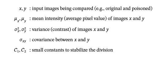结构相似性指数测量 (SSIM) 评估原始图像和中毒图像在全局层面上的感知相似性,不仅考虑像素差异,还考虑结构信息。 它由下式给出: