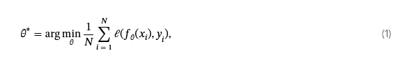 哪里θ是模型参数;ℓ(⋅)是交叉熵损失;fθ(⋅)是模型的函数;x我是训练数据集中的样本;y我是相应的标签,而1N∑我=1N表示总体上的平均损失N训练示例。