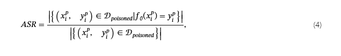 攻击成功率 (ASR) 通过量化模型在触发因素存在时将中毒样本错误分类为目标类别的概率来衡量后门攻击的有效性。 它被定义为: