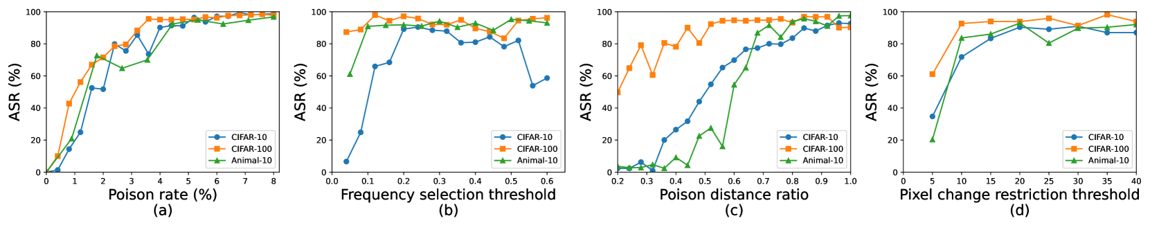 图 5:(a) 毒率、 (b) 频率选择阈值、 (c) 毒迹距离比和 (d) 像素变化限制阈值对 ASR 的影响,在三个数据集上进行评估:CIFAR-10、CIFAR-100 和 Animal-10。 增加这些参数中的任何一个通常都会导致更高的 ASR,表明攻击效果更强。