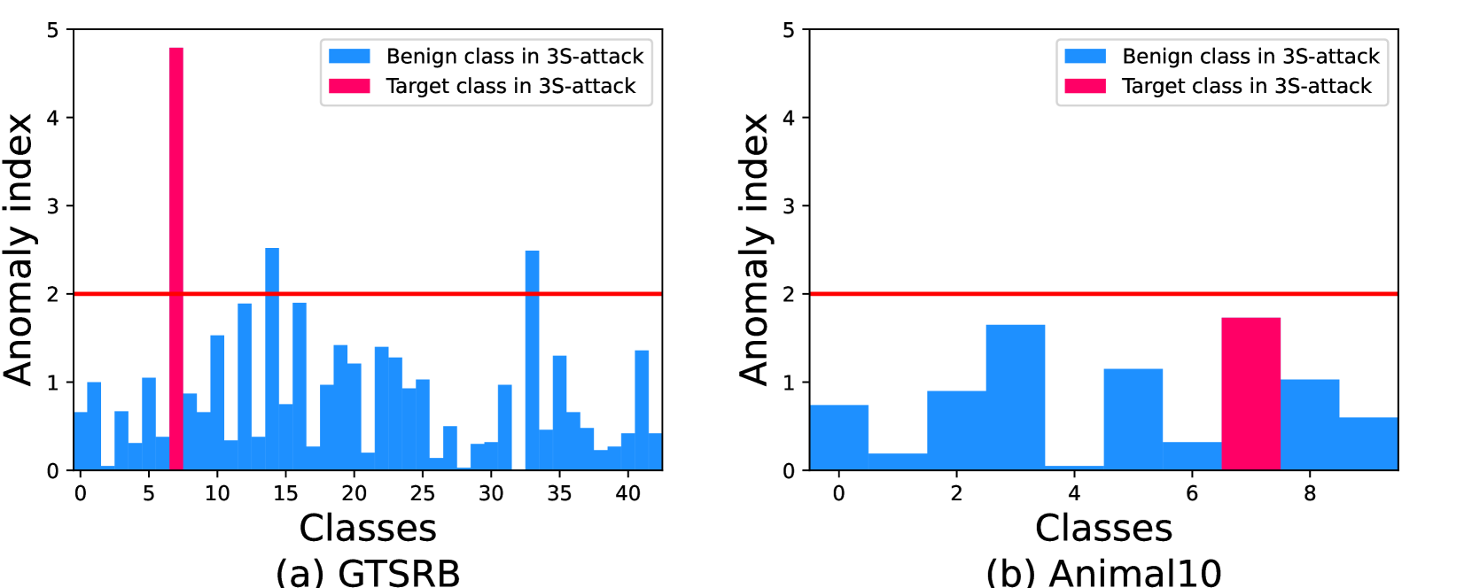 图 9 显示了应用于目标类别为 7 的 3S 攻击的 NC 防御中每个类别的异常指数。 子图 (a) 显示了 GTSRB 数据集上的结果,其中 7 类表现出明显更高的异常指数,远高于检测阈值,表明 3S 攻击被有效检测到。 然而,在子图 (b) 中,基于 Animal10 数据集,类 7 的异常指数为 1.73,仍然相对较高,但低于阈值。 此外,另一个干净类也具有 1.65 的可比异常指数。 这些结果表明,虽然 NC 在某些条件下可以有效地检测 3S 攻击,但不能保证其在所有设置中的可靠性。 由于 DNN 的黑盒性质,这种不一致的根本原因很难确定。 一种可能的解释是,在某些情况下,该模型学会将某些微妙的、重复出现的像素模式(在所有中毒样本中共享)关联为有效触发器,从而通过 NC 成功进行逆向工程。