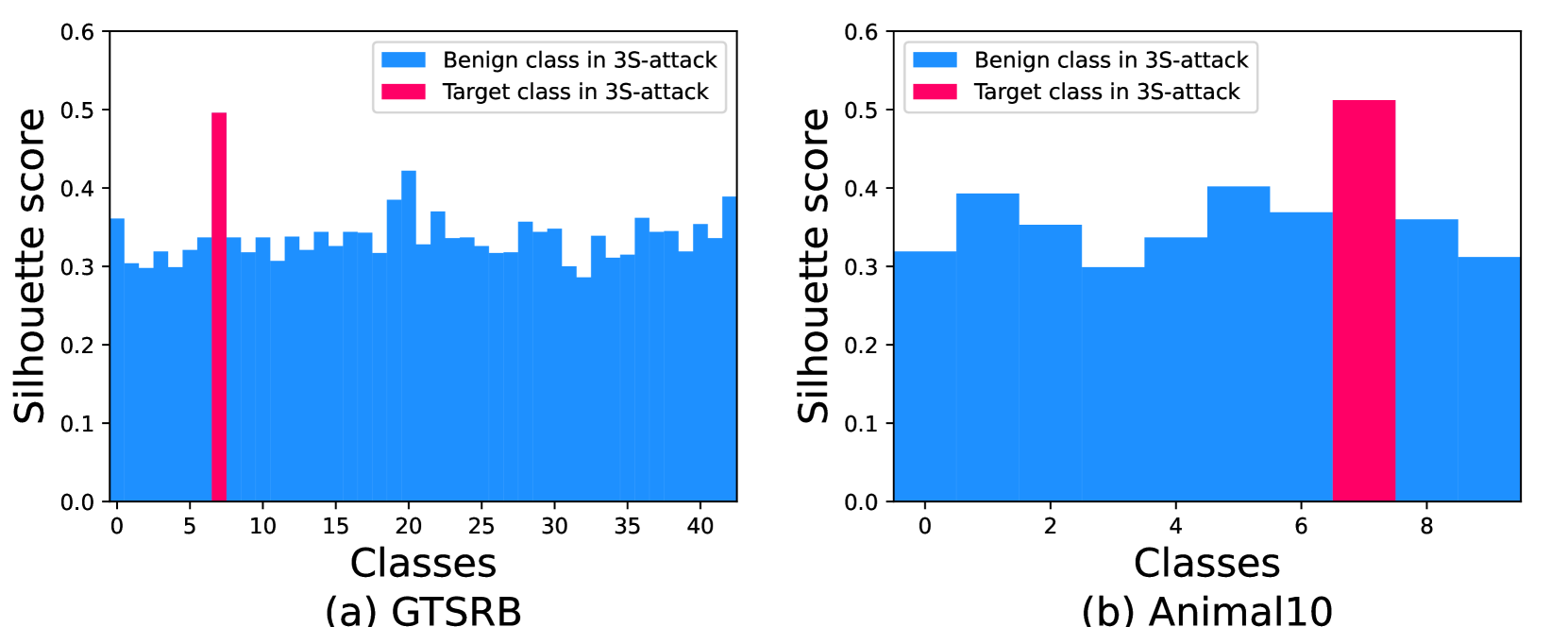 图 10:在 GTSRB 和 Animal10 数据集上针对 3S 攻击的激活聚类实验结果。