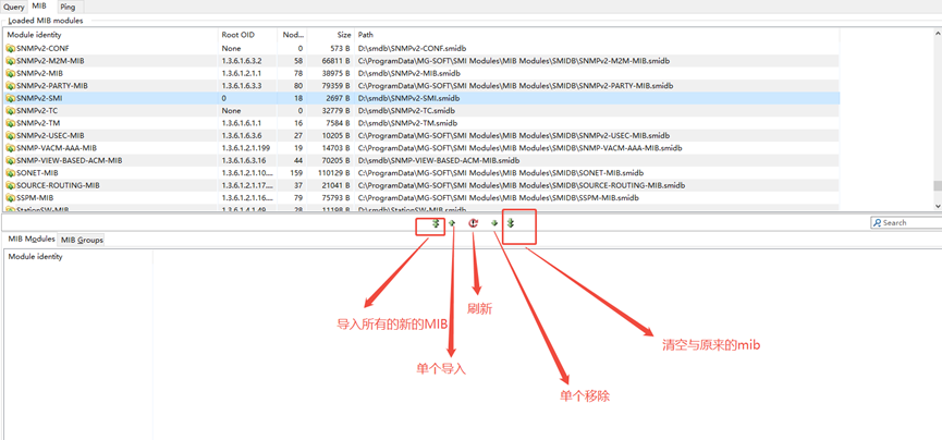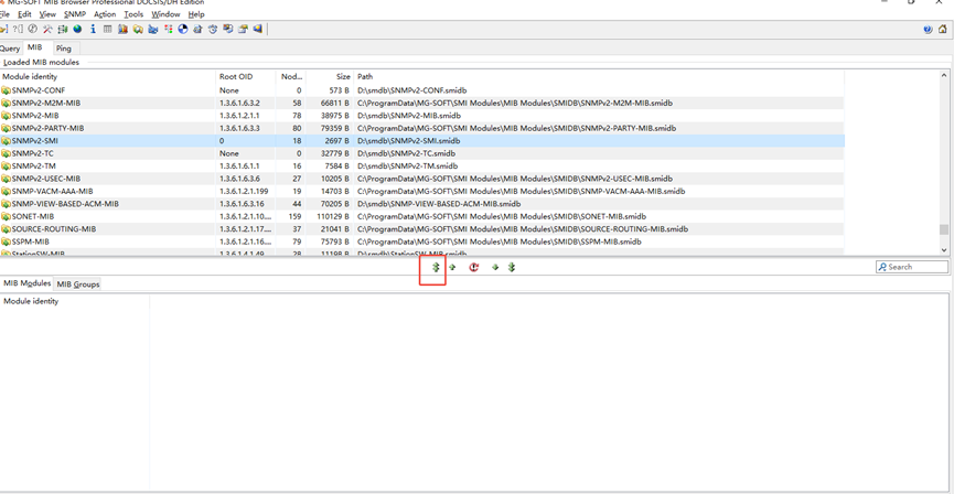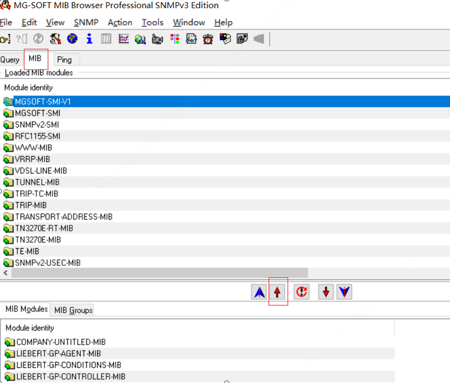 先点击左上角mib按钮,进入mib加载界面,再选中要加载的文件,点击红色向上箭头加载。蓝色向上箭头加载所有。
