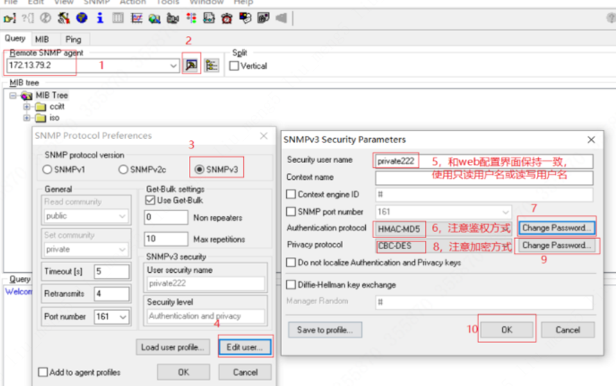 web 配置界面和mib browser界面设置相同。Read Community和Write Community不能相同。Trap Address设置为安装Mib browser工具的电脑的ip。