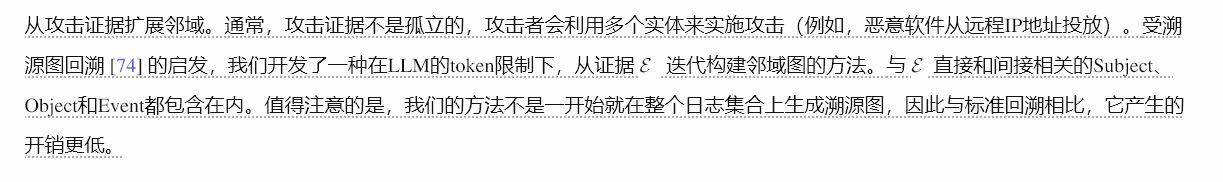 攻击调查。对于每个任务,我们使用 <证据邻域 ENBR,良性配置文件 R,攻击证据 E > 提示 LLM M进行攻击调查。为了规范 LLM 的响应,我们精心设计了提示模板,其中包含多个指导部分:调查范围(针对要调查的实体类型)、环境(针对受监控机器的运行环境)、目标(指导调查步骤)和输出格式(指定分析师所需的 3 个结果以及所需的格式)。受到思维链 (CoT) 机制 [66] 的启发,在“目标”部分,我们要求 M 将整个攻击活动分解为多个步骤,以提高响应的正确性。具体来说,我们的提示首先要求提供详细的叙述,概述攻击过程,从而提供对攻击过程的全面概述,提供对攻击者动机的宝贵见解,并提高检测到的攻击活动的覆盖范围。接下来,我们的提示要求 LLM 描述执行攻击所采取的步骤。为了确保形式性和一致性,我们将步骤名称与 MITRE ATT&CK 框架 [29] 中定义的策略(例如,初始访问、权限提升)对齐。最后,我们的提示要求 LLM 根据获得的攻击叙述和攻击步骤,以入侵指标 (IoC) 的形式推导出恶意实体。我们将发布提示。定位攻击实体和事件。我们让 LLM 列出入侵指标 (IoC),并且需要一个额外的步骤来定位它们在测试集中是否存在,以进行实体级别和事件级别的分类。首先,我们通过在主题和对象字段上使用 IOC 进行精确字符串匹配,来定位攻击窗口中的实体。具有相同名称但不同 ID 的实体将一起发出警报。基于已识别的攻击实体,相关的事件被识别为攻击事件。