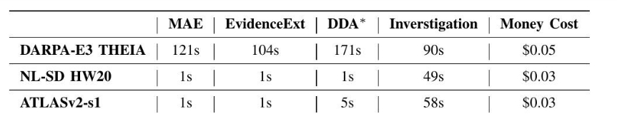 表X 效率和成本。DDA∗ 仅在离线状态下执行一次,在攻击调查之前。MAE、EvidenceExt、DDA 和调查分别是第 IV-B、IV-C、IV-D 和 IV-E 节中描述的组件。