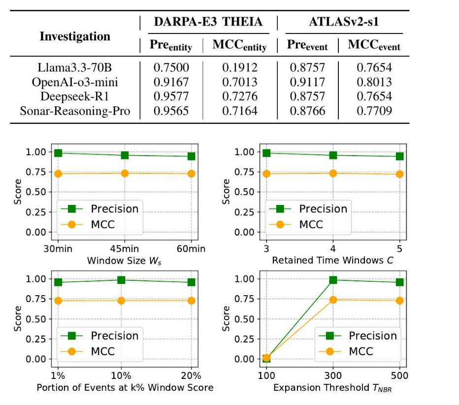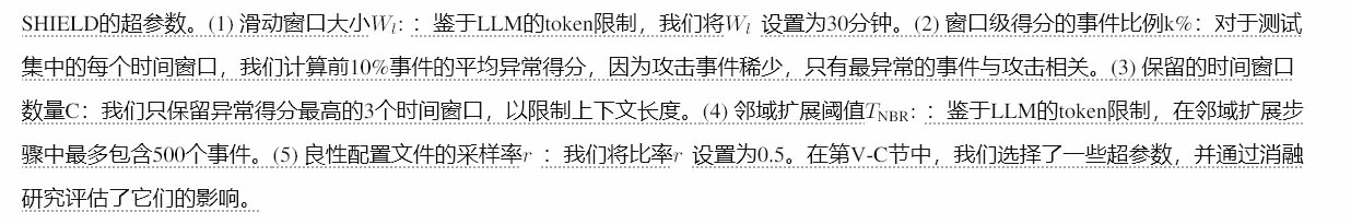 LLM。对于SHIELD使用的LLM,我们选择了四个模型,它们代表了规模、推理能力和可访问性的范围,包括DeepSeek-R1 [85]、LLaMA 3.3-70B [86]、OpenAI o3-mini [87]和Sonar Reasoning Pro [88]。默认情况下,我们使用DeepSeek-R1(671B参数),因为它代表了新一代的开源模型,擅长推理和结构化信息处理。我们还包括LLaMA 3.3-70B作为另一个开源LLM,与DeepSeek-R1相比,它的模型尺寸更小,并且以处理长上下文和复杂任务的能力而闻名。对于闭源模型,选择o3-mini是因为它具有快速的响应时间和强大的指令遵循能力。我们 включваме Sonar,因为它强调逐步逻辑推理,这对于攻击调查中的多跳推理非常重要。