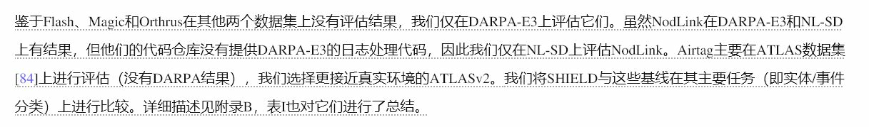 尽管 SHIELD 实现了更好的总体性能,但与 Flash 和 MAGIC 相比,我们观察到在 CADETS 和 THEIA 上有更高的 FN。对于 THEIA,55 个 FN 中有 50 个与执行相同不完整命令(/home/admin/profile)的实体相关联,该命令仅包含 exec 而没有额外的上下文(例如,文件名)。这突显了在部分或模糊信息下检测攻击实体的必要性。