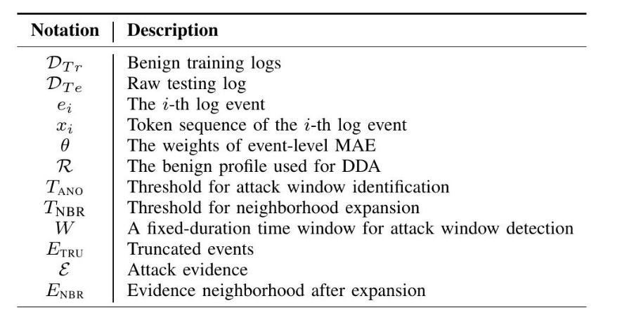 首先,我们观察到一些主机入侵检测系统(HIDS)能够在检测包含攻击事件的时间窗口时实现高精度[24],[25],这启发我们构建一个事件级别的掩码自编码器(MAE)[26]来检测攻击窗口。与先前在每个窗口上执行子图级别分类的工作不同,我们的事件级别MAE直接处理文本格式的日志,从而显著减少了表I SHIELD与一些最新HIDS之间的比较。HIDS的详细信息在附录B中描述。除精度之外的详细评估结果在第五节中报告。