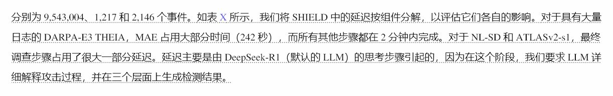 为了评估SHIELD的效率,我们测量了在DARPA-E3 THEIA、NL-SD HW20和ATLASv2-s1子数据集上攻击调查的延迟(不包括MAE的训练阶段和日志预处理阶段),这些数据集包含
