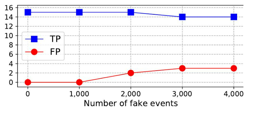 为了评估SHIELD对抗对抗性攻击的鲁棒性,我们使用[30]中的实现来模拟针对HIDS的模仿攻击。模仿攻击操纵分布图编码,以在恶意和良性实体的邻域分布之间创建欺骗性的相似性。我们选择DARPA-E3 CADETS子数据集,并注入1,000到4,000个范围的虚假事件(即,边),并在图5中显示TP和FP的变化。值得注意的是,对于CADETS,只有161个攻击实体可以用来注入边,因此注入的边已经过多。从图中,我们观察到,在添加超过1,000条虚假边之前,SHIELD的TP和FP保持不变。即使当有4,000条边时,TP和FP的变化也很小(TP从15到14,FP从0到3)。注入的边确实会引入背景噪声,从而影响LLM的决策,但影响得到了很好的控制,这主要基于SHIELD的设计,例如,除了实体分类之外,还生成攻击叙述以实现自我一致性。