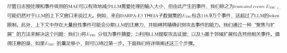 我们遇到的第一个问题(问题-1)是每个LLM产品对上下文窗口的令牌限制。例如,GPT-4仅允许8,192个输入令牌。尽管最近的LLM显著增加了令牌限制(例如,GPT-4o支持128,000个输入令牌),但它们仍然落后于实际环境中生成的海量主机日志:例如,使用OpenAI的tiktoken [62]估计,DARPA-E3 CADETS子数据集的令牌计数为32.76M,远远超过任何LLM的令牌限制。