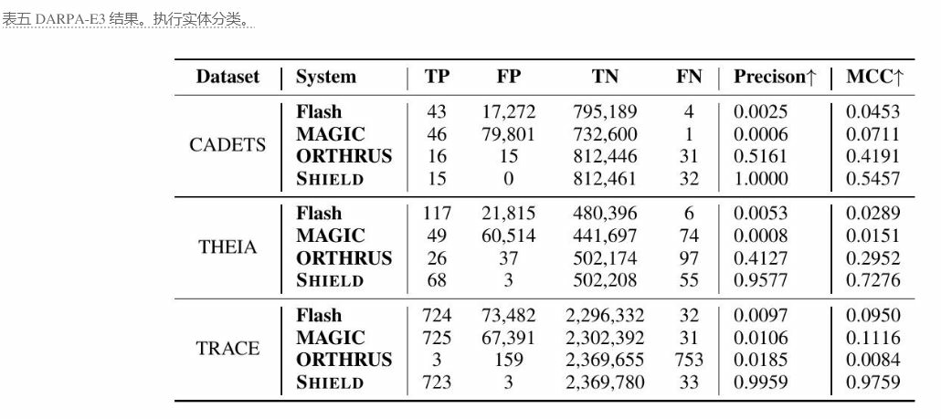 DARPA-E3。在表V中,我们展示了SHIELD的检测结果,并将其与Flash、MAGIC和ORTHRUS进行比较。我们发现Flash和MAGIC产生了大量的误报(FP),规模达到数万,这导致了低精度(在所有子数据集上均低于0.1)。尽管Flash和MAGIC在他们的论文中报告了高精度,但如果一个节点位于ground-truth报告中提到的节点的2跳范围内,他们就将该节点标记为恶意节点,这导致了对恶意节点的过高估计。[14]中也报告了类似的观察结果。ORTHRUS实现了更高的精度,尽管以更高的漏报(FN)为代价。另一方面,SHIELD能够实现非常高的精度(在三个子数据集上均超过0.95),与其他基线相比有很大的优势。对于像DARPA-E3这样不平衡的数据集,MCC提供了一个稳健的测量方法,我们发现SHIELD再次优于其他基线。
