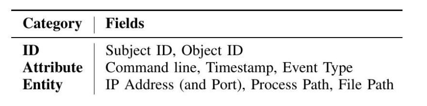 我们首先解析由各种捕获机制生成的原始日志(例如,Windows ETW [31]、Linux Audit [32]和FreeBSD Dtrace [33])。然后,我们选择与命令执行和应用程序活动(包括主机和网络)相关的日志和字段,这些日志和字段嵌入了分析攻击活动的关键信息。这些字段分为三类:1) ID,包括与事件相关联的主体ID和对象ID;2) 事件属性,包括事件类型、主体发出的命令行和事件时间戳;3) 与主体或对象相关联的实体信息,包括主体的进程路径、IP地址、端口号和对象的文件路径。我们发现,ID和事件属性由我们用于评估的所有数据集提供,但实体信息可能不存在。在后一种情况下,我们仅使用ID和事件属性。我们将