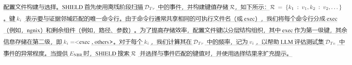 值得注意的是,我们没有遵循一种流行的方向,即构建溯源图并应用图学习算法进行威胁检测(也在第II-A节中进行了调查)。正如[11]、[27]所论证的那样,溯源图的构建、保存和计算可能会产生很高的开销,这对于时间约束下的攻击调查来说并不理想。我们选择了一条较少探索的路径,即将日志视为文本语料库[11]、[27],并应用自然语言处理技术(例如,MAE)和大型语言模型,从而同时实现高准确性和高效率。也就是说,我们观察到日志中主体/客体之间的关系非常重要,而SHIELD通过对日志进行仔细的预处理来保留这些关系。
