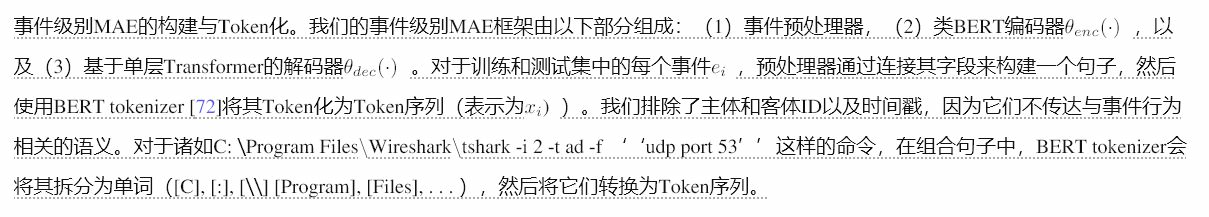 为了缓解令牌限制问题(问题 1)和“中间迷失”效应(问题 2),我们采用了掩码自编码器 (MAE) [26],并设计了一个事件级别的 MAE,旨在定位可能包含攻击痕迹的事件。由于其非对称的编码器-解码器设计,事件级别的 MAE 继承了 MAE 通过恢复掩码输入来学习有意义的文本嵌入的能力 [26]。
