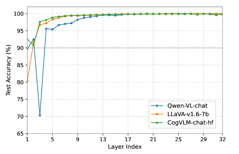 图2:测试线性分类器的精度,区分 LVLM 中中间层的安全和有害输入。