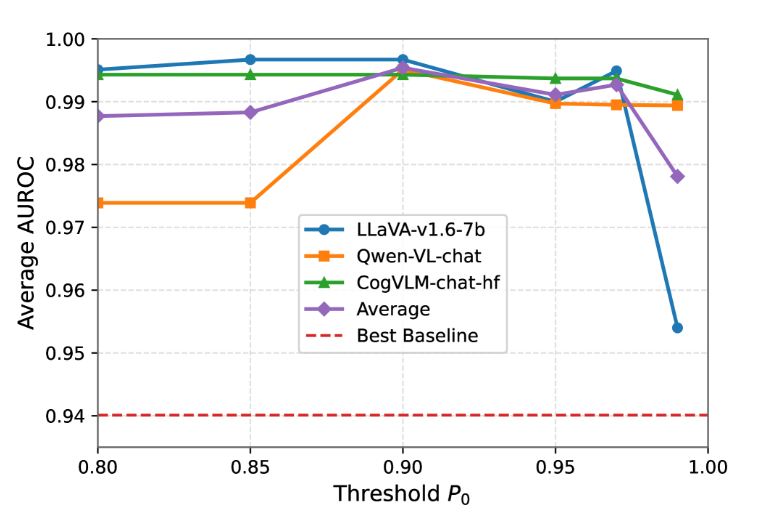 图5:三种模型在不同阈值下的五个基准测试的平均 AUROC 得分P0∈{0.8,0.85,0.9,0.95,0.97,0.99}.虚线表示现有基线实现的最佳 AUROC。