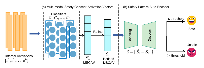 我们的学习检测 (LoD) 框架如图 111 所示。 它将派生自我并预测是否我包含越狱攻击。 我们没有使用原始激活,而是通过一组特定于层的分类器将它们转换为多模态安全概念激活向量(MSCAV),这些分类器提供了准确和细粒度的安全表示,用于区分安全输入和攻击。 MSCAV 的每个元素都估计模型考虑的概率我不安全的。 然后将 MSCAV 输入安全模式自动编码器,以便在未知越狱场景中实现无监督检测。 自动编码器 (AE) 专门针对安全样品进行训练,并通过计算重建误差来执行异常检测。 对抗性输入偏离了学习到的安全分布,因此被视为异常。AE的重建损失可以作为异常检测的有效措施(樱田和亚伊里201420142014). 在以下部分中,我们将详细介绍这两个关键组件:多模态安全概念激活向量和安全模式自动编码器。