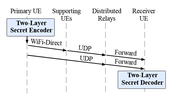 图2. 多层秘密共享协议。通过WiFi直连分发,然后进行并行多路径传输。