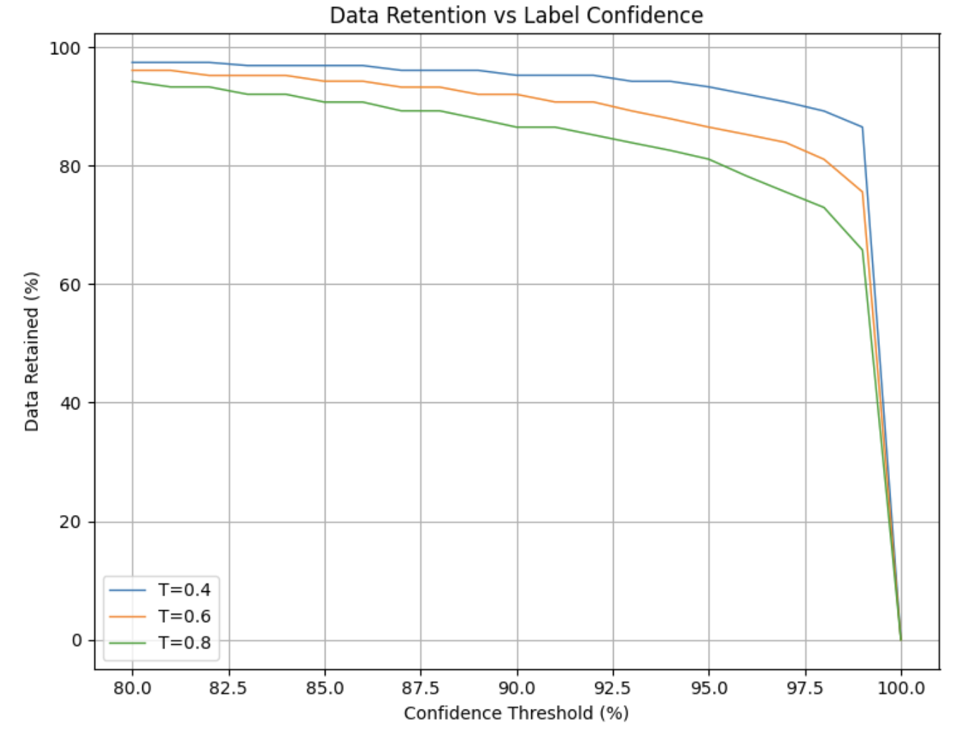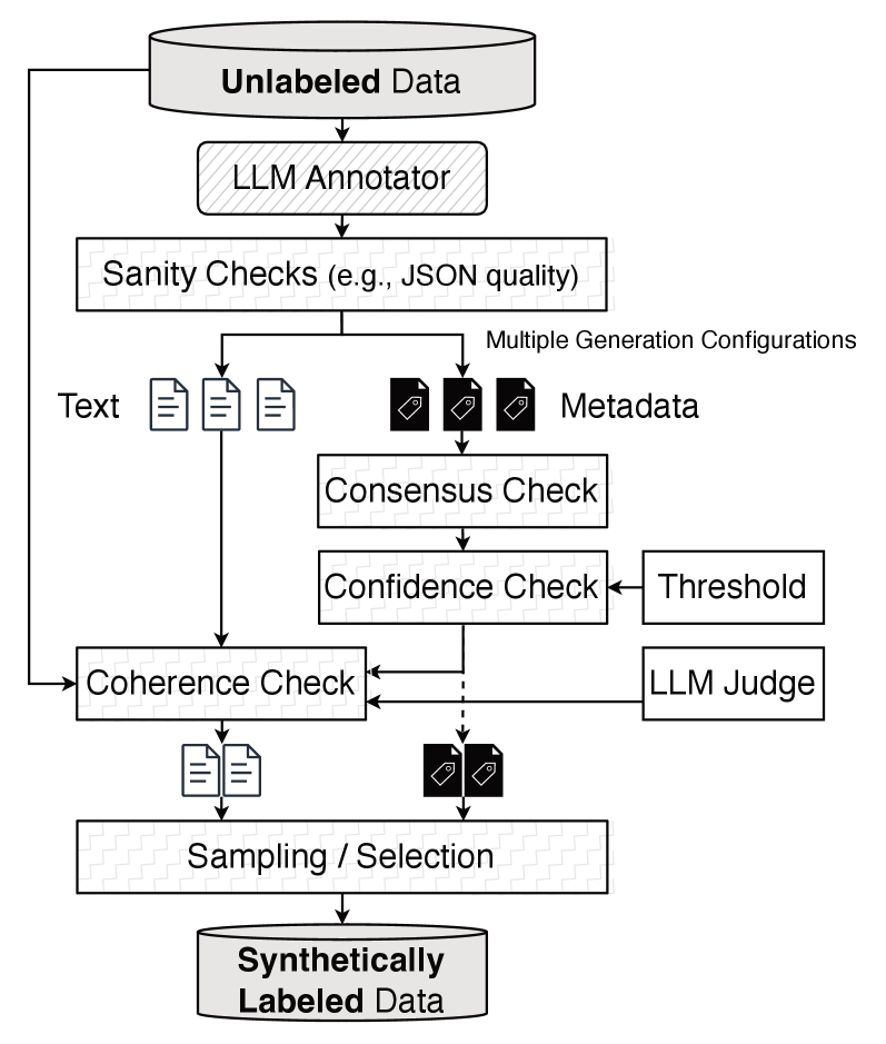 图 4:伪标签质量过滤流程。 LLM 标注器使用多种配置(例如温度设置)生成元数据和自然语言解释以确保可靠性。如果元数据在不同配置下保持一致并满足置信度阈值,则样本通过过滤。然后,一个 LLM 评判者验证生成的解释与元数据标签之间的一致性。