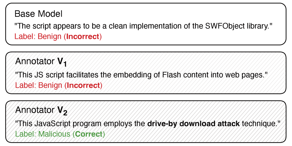 在网络安全中,半监督学习在减少手动标注需求方面一直显示出潜力。虽然大量工作集中在可移植可执行文件恶意软件分析上(joyce2023motif; CybIN; Corlatescu-NeurIPS-2023; Anderson-ArXiv-2018),但基于脚本的威胁提出了独特的挑战。Alam-ArXiv-2025 使用伪标注在其自身预测上重新训练恶意软件分类器,而 Feng-IEEE-2025 则通过特征提取和提示工程展示了 LLM 在 Android 恶意软件检测中的有效性。关于我们工作的主要焦点,即网络威胁的自然语言解释,Fujii-ESORICS-2024 表明 LLM 可以准确解释恶意软件功能,但他们强调了高质量训练数据有限这一重大挑战。Lu-IEEE-2025 通过创建一个名为 MalS 的新数据集来解决这一局限性,该数据集使用 LLM 生成的摘要草稿并经过轻度人工 refinement,并通过微调取得了强劲的结果。