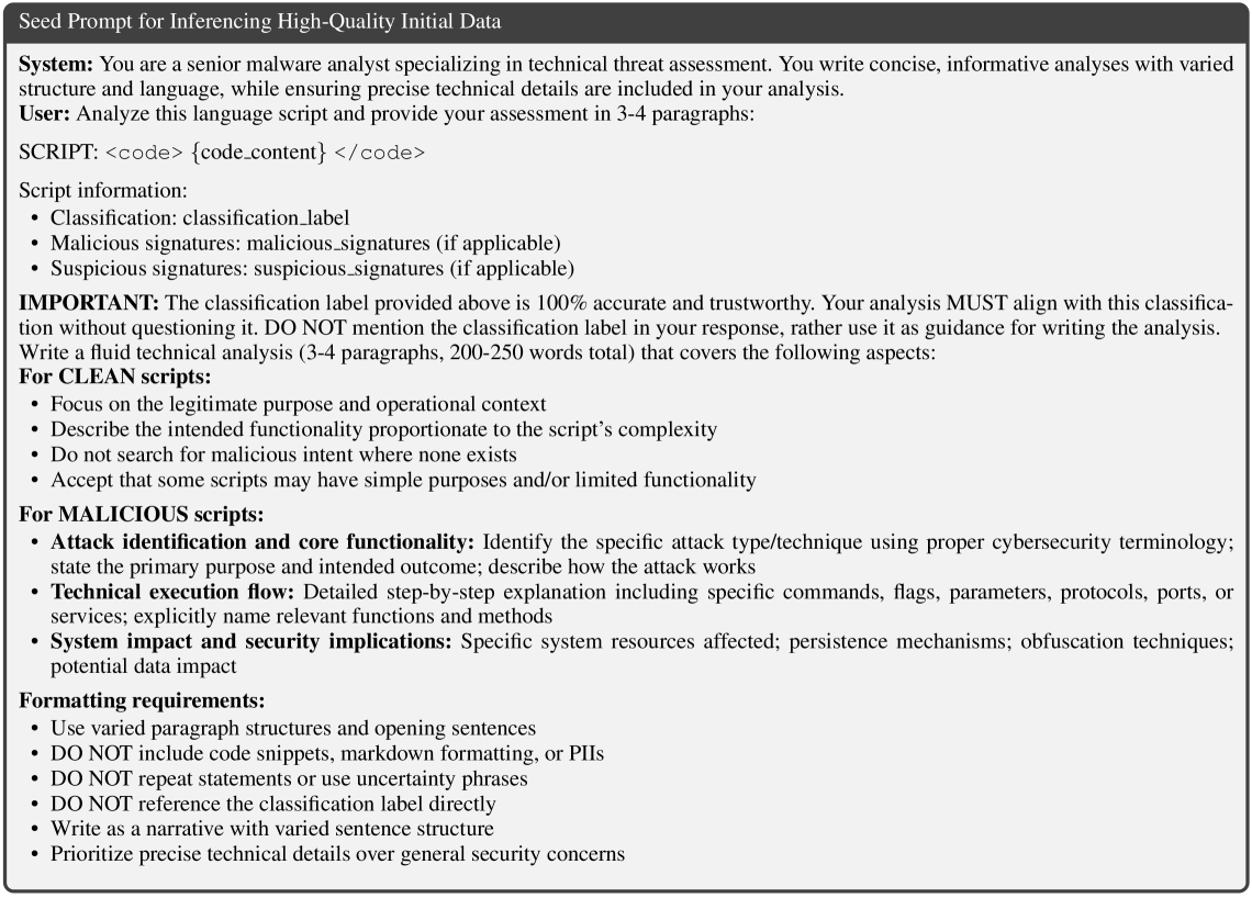 为确保恶意软件标签的质量,我们结合了多个验证来源:(1)用于检测已知恶意模式的 YARA 规则(Lockett-CoRR-2021),(2)用于动态分析的沙箱引爆(Guven-IJCESEN-2024)以及(3)专家手动验证。为了生成高质量的脚本行为描述,我们利用沙箱引爆报告获取技术背景,并使用 Llama-3.3-70B-Instruct(温度 τ=0.3)。我们注意到,手动验证是由具有专业网络安全知识的主题专家(SME)进行的。他们审查了脚本内容和相应的沙箱引爆报告,以确保准确分类恶意和良性样本。这种方法遵循了先前的研究方法(Li-ICLR-2024; Corlatescu-NeurIPS-2023; Wang-ArXiv-2022; Anderson-ArXiv-2018),同时解决了获取专家标注数据的挑战。