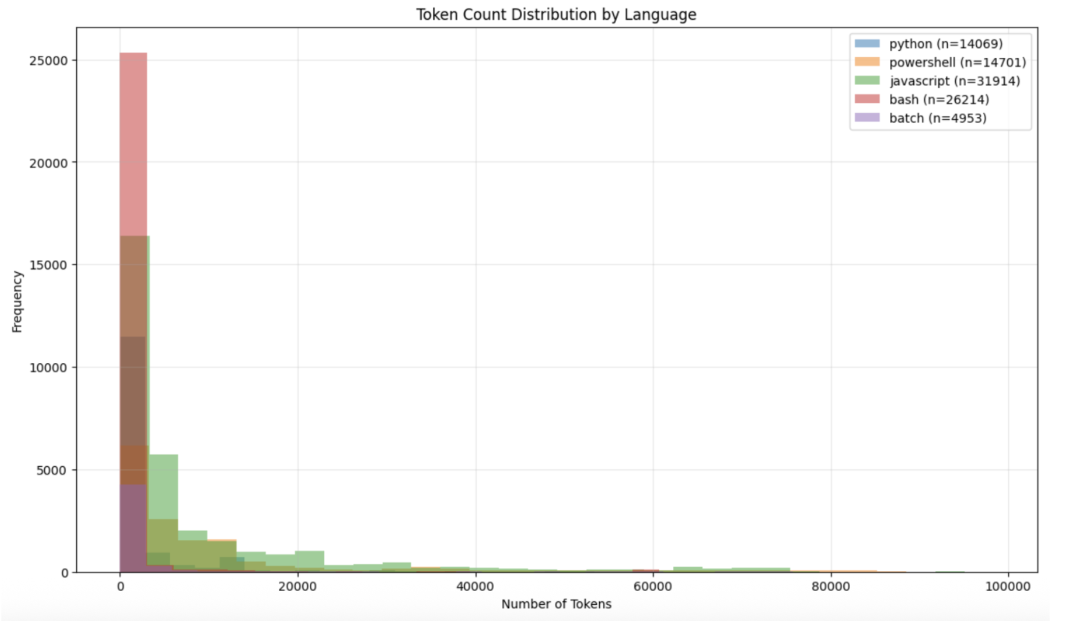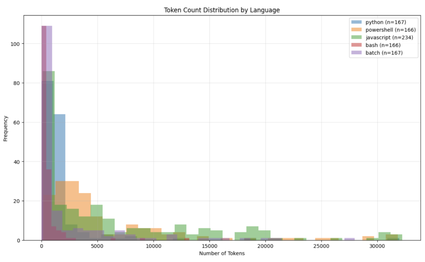 表 1:按语言和恶意性标签划分的数据集中脚本分布。 种子集和测试集通过多个来源(包括专家验证)进行了严格验证。*初始语料库和训练集标签源自内部标注自动化,仅供参考。由于这些标签固有的噪声,训练集被视为未标注数据。语言:Bash (sh)、Batch (bat)、JavaScript (js)、PowerShell (ps) 和 Python (py)。**