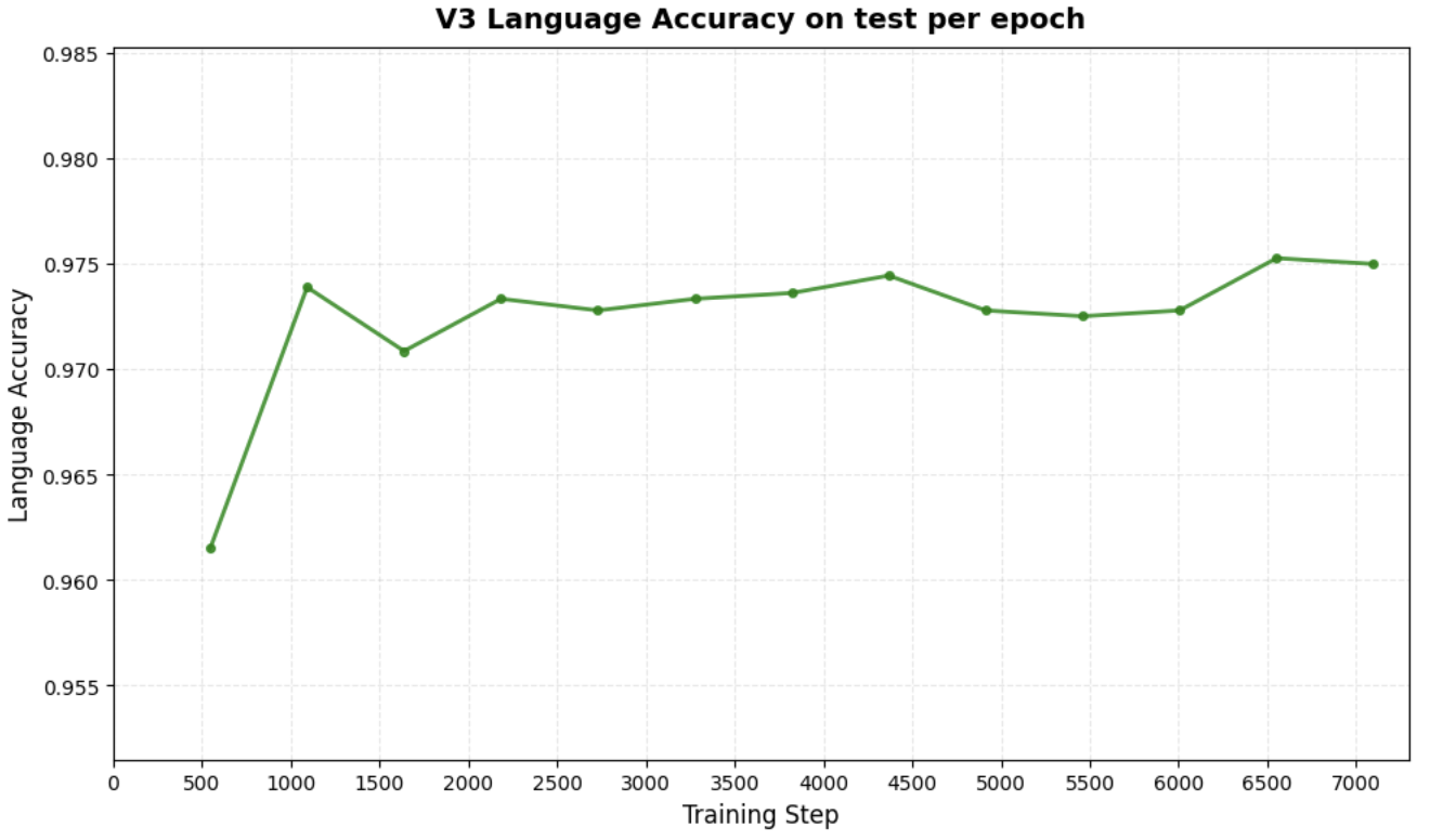 图 19:标注器 V3 的语言识别准确率进展,在第 13 个 epoch 展示了 97.52% 的峰值性能, marginally 超过 V2 的 97.14% 准确率。