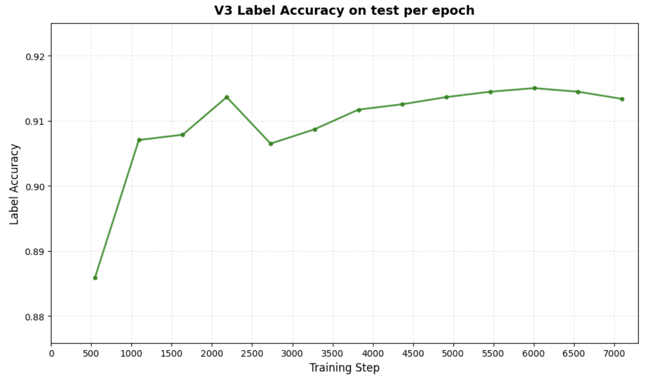 图 18:标注器 V3 在训练周期内的标注准确率性能评估,在第 10 个 epoch 达到 91.53% 的峰值准确率,与 V2 的性能匹配。