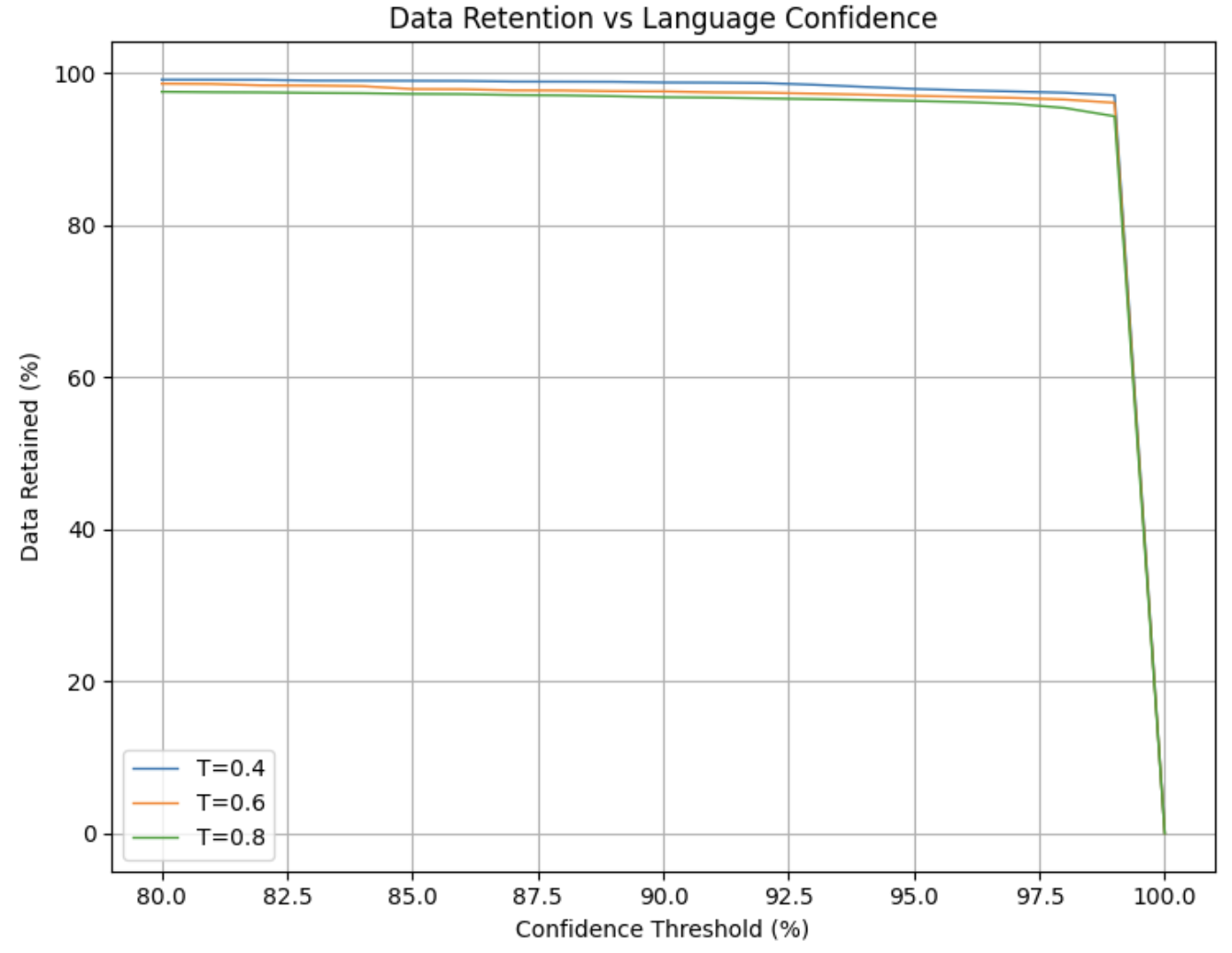 我们对第三代标注器(V3)的调查显示收益递减。在对扩展数据集(≈250K 样本)进行标注期间,V2 表现出比 V1 增加的预测噪声,需要修改过滤策略,包括在我们的共识检查中排除温度 0.8,以防止由于温度引起的失配而丢失大约 50% 的生成样本。尽管进行了这些调整并在扩展语料库上训练 V3,但性能指标最多只显示出边际改进,如图 18 和 19 所示:标签准确率峰值在 91.53%(第 10 个 epoch),与 V2 的性能匹配,而语言准确率达到 97.52%(第 13 个 epoch), marginally 超过 V2 的 97.14%。这些结果表明最佳性能在两次迭代时达到稳定期。