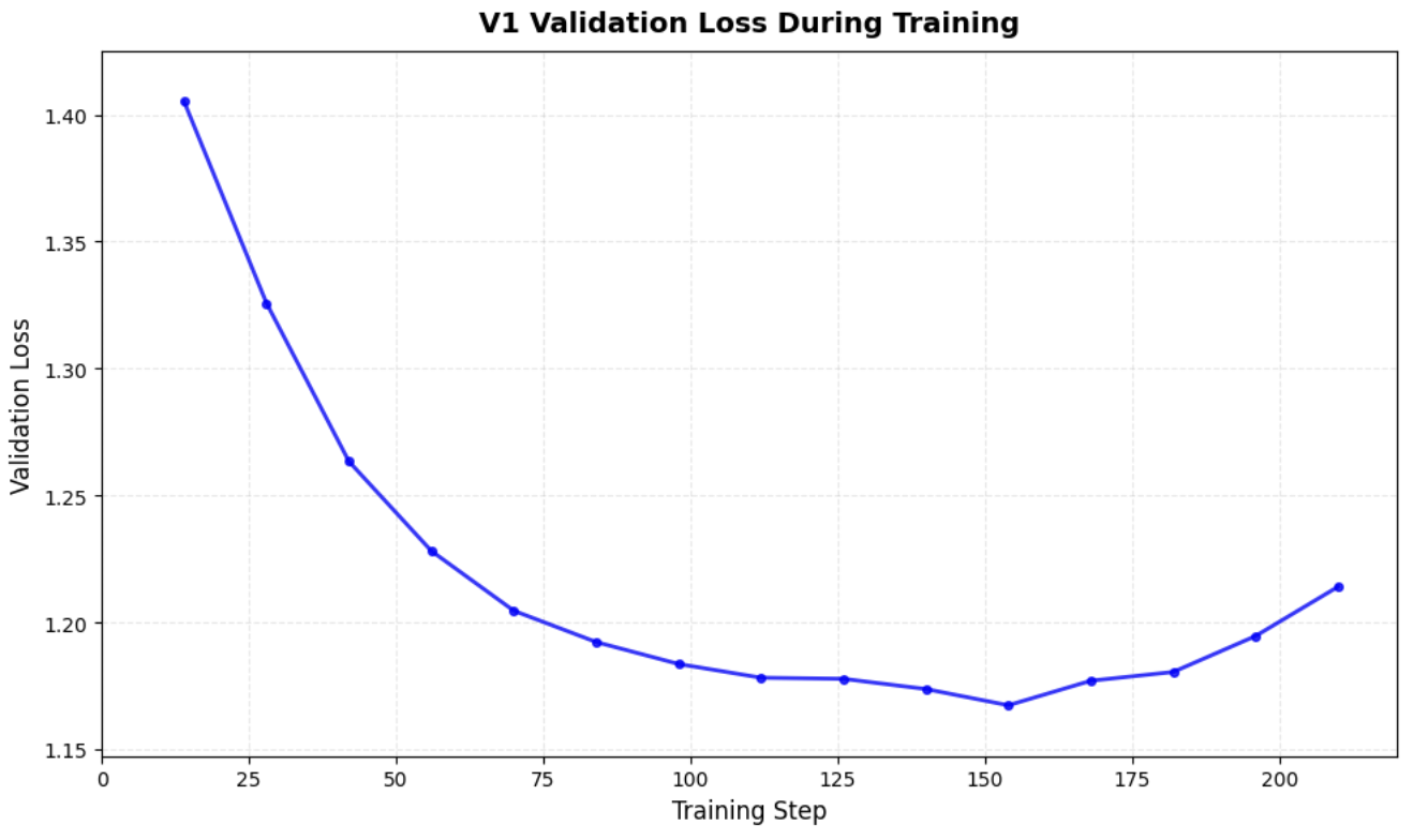 图 16 和 17 中描述的图表代表了 V1 和 V2 模型训练阶段的验证损失。它们展示了略有不同的收敛模式,指导了我们的检查点选择过程。对于在 900 个高质量种子样本上训练的标注器 V1(图 16),验证损失在整个训练过程中平稳下降。最佳性能在第 11 个 epoch(第 154 步)达到,此时损失曲线在后续 epoch 显示过拟合迹象之前趋于稳定。