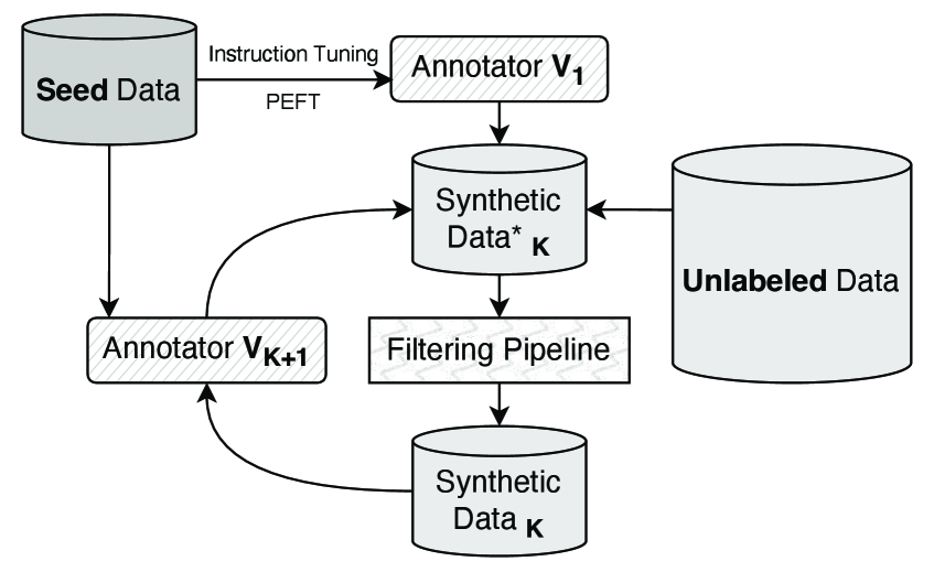 图 1:自训练方法。 一个包含 900 个高质量标注样本的种子数据集通过伪标注启动半监督学习。在种子数据上训练的 LLM 为未标注数据生成经过滤的伪标签,从而能够通过扩展训练数据实现迭代改进。